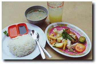 Note: I am extremely impressed by the socio/cultural diversity of Singapore. It is almost as diverse as Los Angeles, but markedly more integrated. At the lunch tables you will see Americans, Europeans, Australians, New Zealanders, Chinese, Malay, Indian, and Indonesians. While walking around downtown I have also seen Africans, Filipinos and Japanese (Although there is quite a bit of anti-Japanese sentiment here, as Singapore was one of the many countries brutally ravaged by the Japanese war machine in the 30's and 40's.)Stephen explains that it is best to eat just before noon since the food is still fairly fresh but that I should avoid eating too much later. He has had food poisoning a couple of times in three years, but those two experiences were enough to modify his eating schedules. He also directs me to one Malay stall where he says he frequents regularly. They have several stew-like/curry dishes based on mutton, chicken, pork and fish atop a bed of rice. I get a mutton/chicken combination for 1.30 $US.